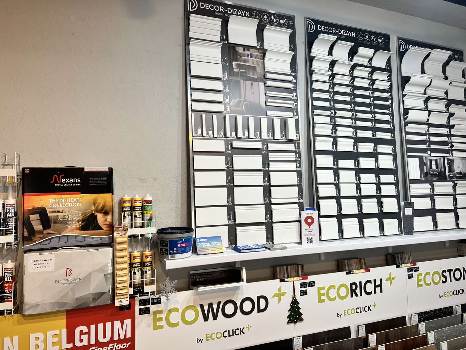 - Напольные покрытия: инженерная и массивная доска, premium-класс ламинат, керамогранит, комплекты «теплый пол».